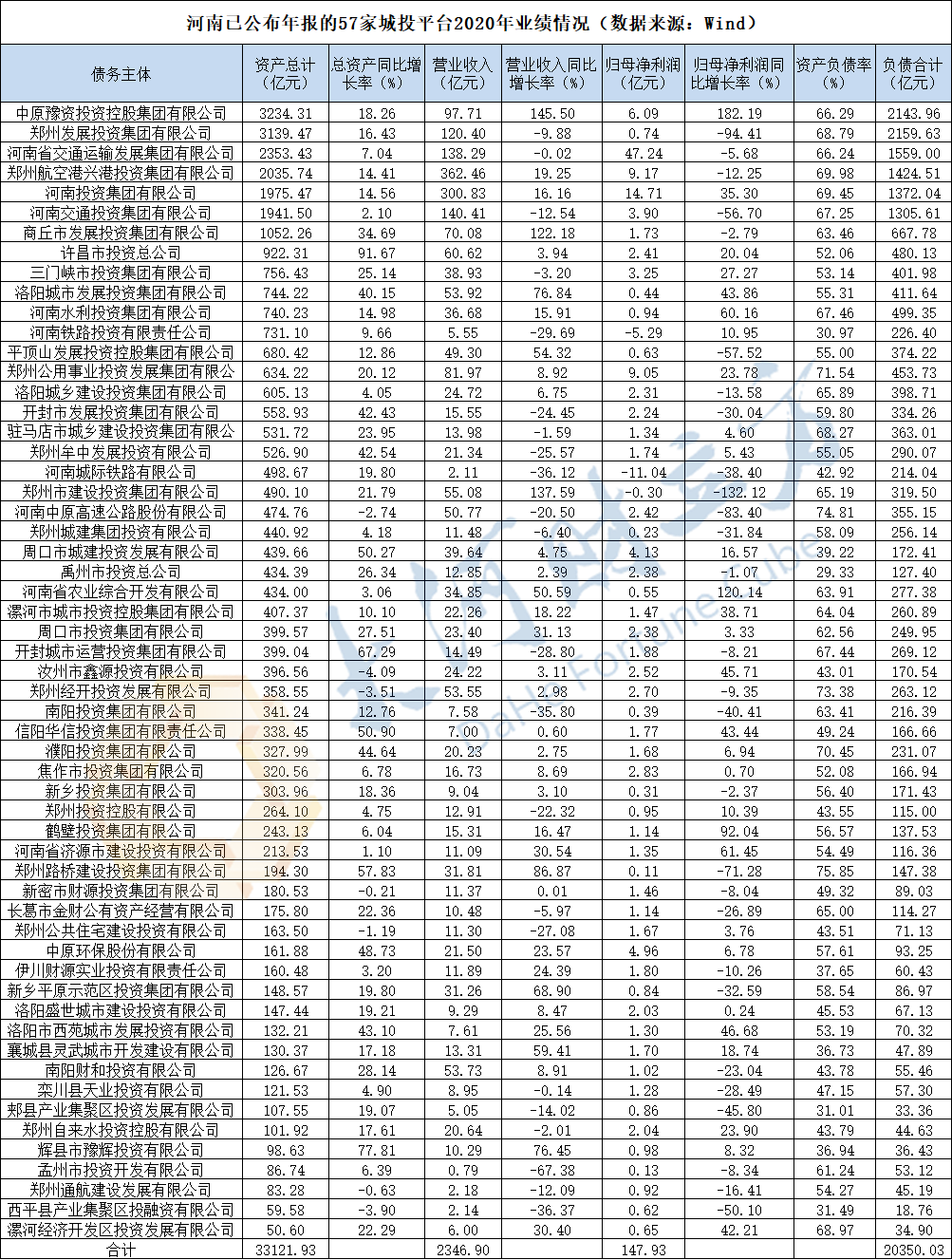 據(jù)Wind統(tǒng)計,目前河南已公布年報的城投平臺共57家(其中河南省豫資城鄉(xiāng)一體化建設(shè)發(fā)展有限公司為中原豫資的全資子公司,暫未計算在內(nèi))。