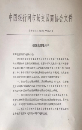 10月14日,南陽投資集團有限公司黨委書記、董事長楊振中、國家開發(fā)銀行河南省分行市場與投資處處長張東東、招商銀行南陽分行行長金建軍等中期票據(jù)(MTN)發(fā)行相關(guān)人員一行等,赴北京中國銀行間交易商協(xié)會領(lǐng)取中期票據(jù)注冊通知書。本次中期票據(jù)發(fā)行全國共有港閘國資、華潤資產(chǎn)、長春高新、蘇寧易購、南陽投資等11家政府類平臺或電商企業(yè)領(lǐng)取了注冊通知書。10月16日,從中國銀行間市場交易商協(xié)會再次傳來消息,南陽投資集團有限公司申請注冊發(fā)行的20億元3+2年期非公開定向債務(wù)融資工具(PPN)正式獲準(zhǔn)注冊,這是我市歷史上首單平臺類私募債券。至此,南陽投資集團有限公司在銀行間市場上債券直接融資規(guī)模擴大至30億元。