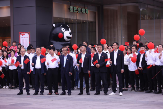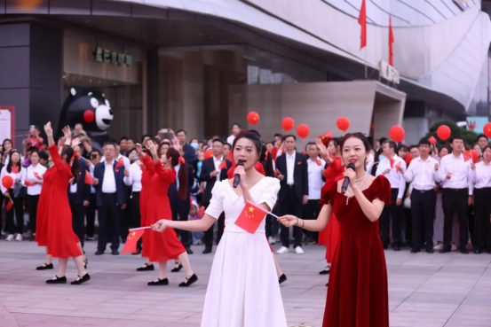 10月1日,南陽市宛城區(qū)建設路與人民路交叉口的360廣場摩根店,一派節(jié)日繁華。隨著歌曲《我和我的祖國》經(jīng)典旋律響起,現(xiàn)場的群眾手舉國旗、載歌載舞,用嘹亮的歌聲和幸福的舞蹈來表白他們對祖國的節(jié)日祝福。