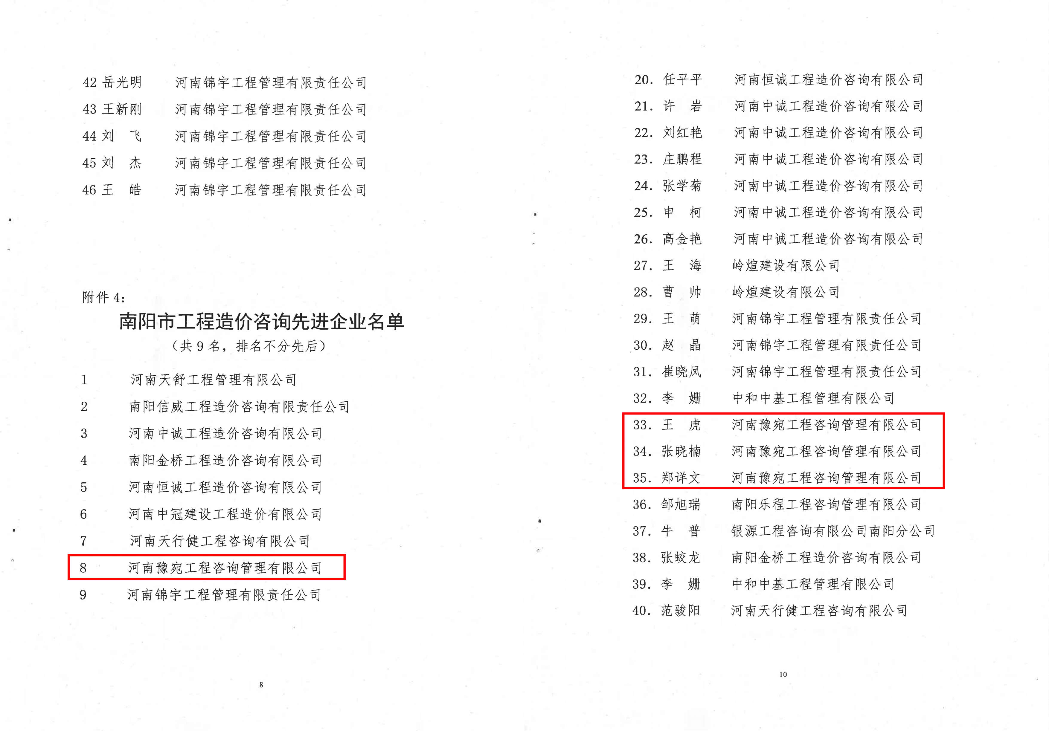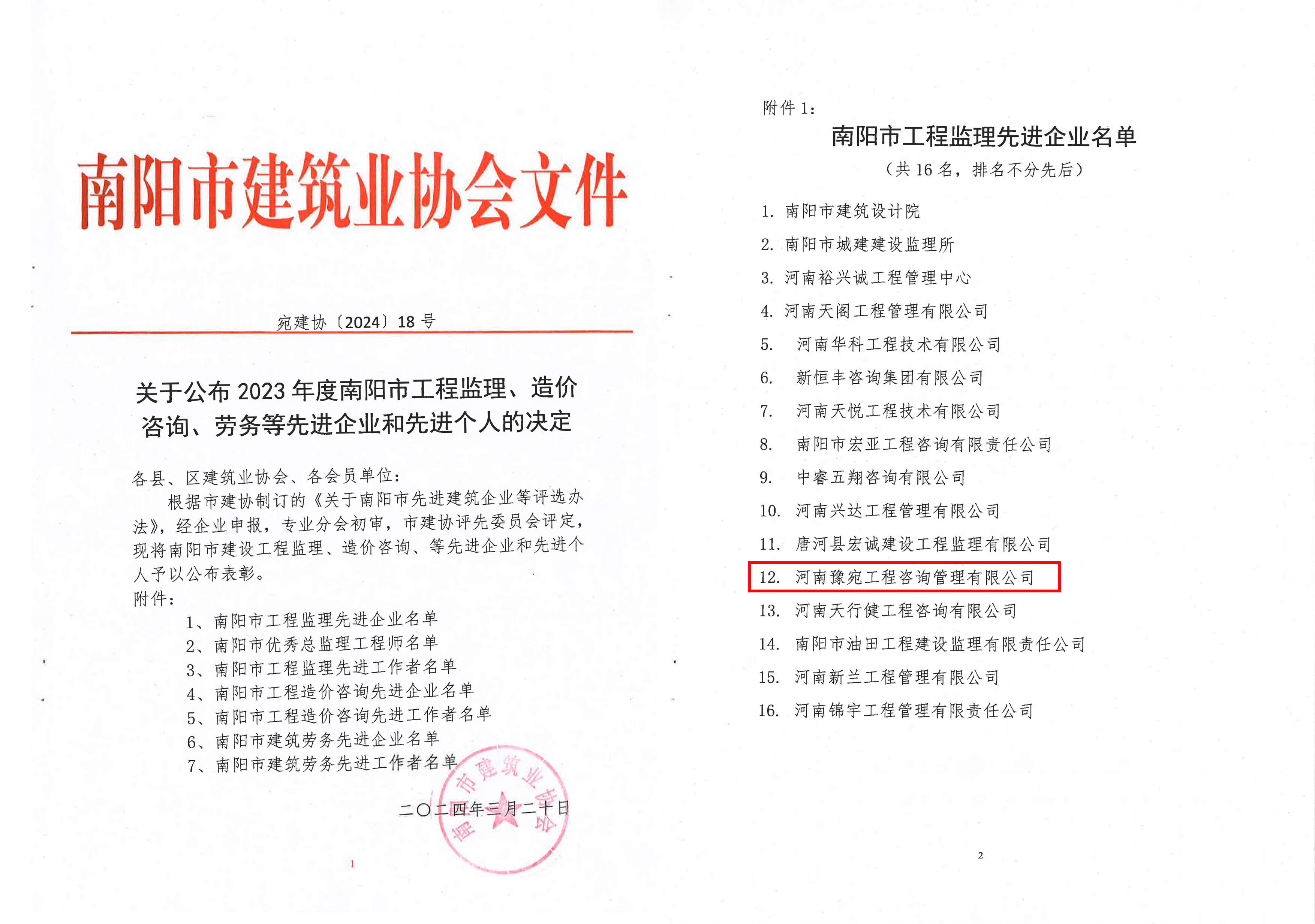 3月25日,南陽市建筑業(yè)協(xié)會召開第六屆第二次會員大會,會議公布并表彰了2023年度南陽市工程監(jiān)理、造價咨詢、勞務(wù)等先進(jìn)企業(yè)和先進(jìn)個人,集團(tuán)下屬河南豫宛工程咨詢管理有限公司(簡稱:豫宛咨詢公司)榮獲南陽市建筑業(yè)協(xié)會頒發(fā)的“2023年度南陽市工程造價咨詢先進(jìn)企業(yè)”和“2023年度南陽市工程監(jiān)理先進(jìn)企業(yè)”兩項殊榮,公司員工王虎、張曉楠、鄭詳文3人獲得“2023年度南陽市工程造價咨詢先進(jìn)工作者”榮譽稱號。