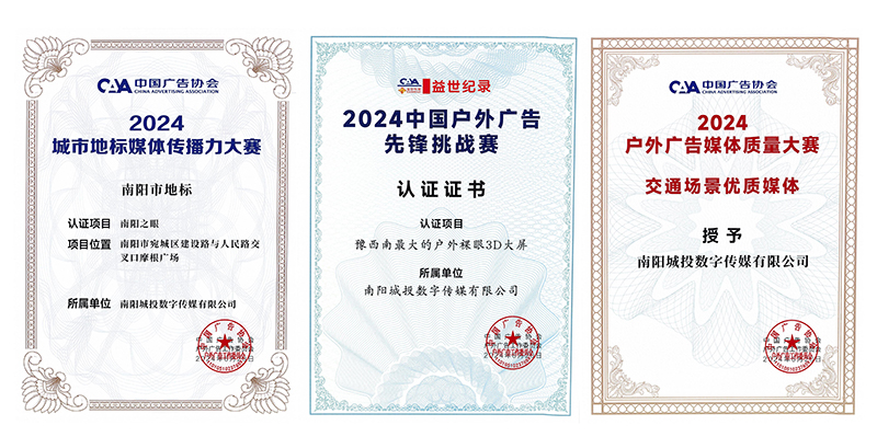 數(shù)字傳媒作為國有平臺運(yùn)營公司,是南陽戶外廣告特許經(jīng)營權(quán)單位,始終堅(jiān)持“政府使命、企業(yè)屬性”,積極踐行“提升城市公共空間環(huán)境品質(zhì),助力現(xiàn)代化省域副中心城市建設(shè)”的使命要求,持續(xù)探索深挖,致力南陽戶外廣告媒體數(shù)字化轉(zhuǎn)型升級。公司旗下繁華核心商業(yè)圈的“南陽之眼”戶外裸眼3D大屏榮膺“2024年中國戶外廣告先鋒挑戰(zhàn)賽豫西南最大戶外裸眼3D大屏認(rèn)證”“2024年城市南陽城市之眼地標(biāo)媒體認(rèn)證”雙認(rèn)證。同時憑借交通場景媒體優(yōu)勢,榮獲“2024年戶外廣告媒體大賽交通場景優(yōu)質(zhì)媒體”獎項(xiàng)。