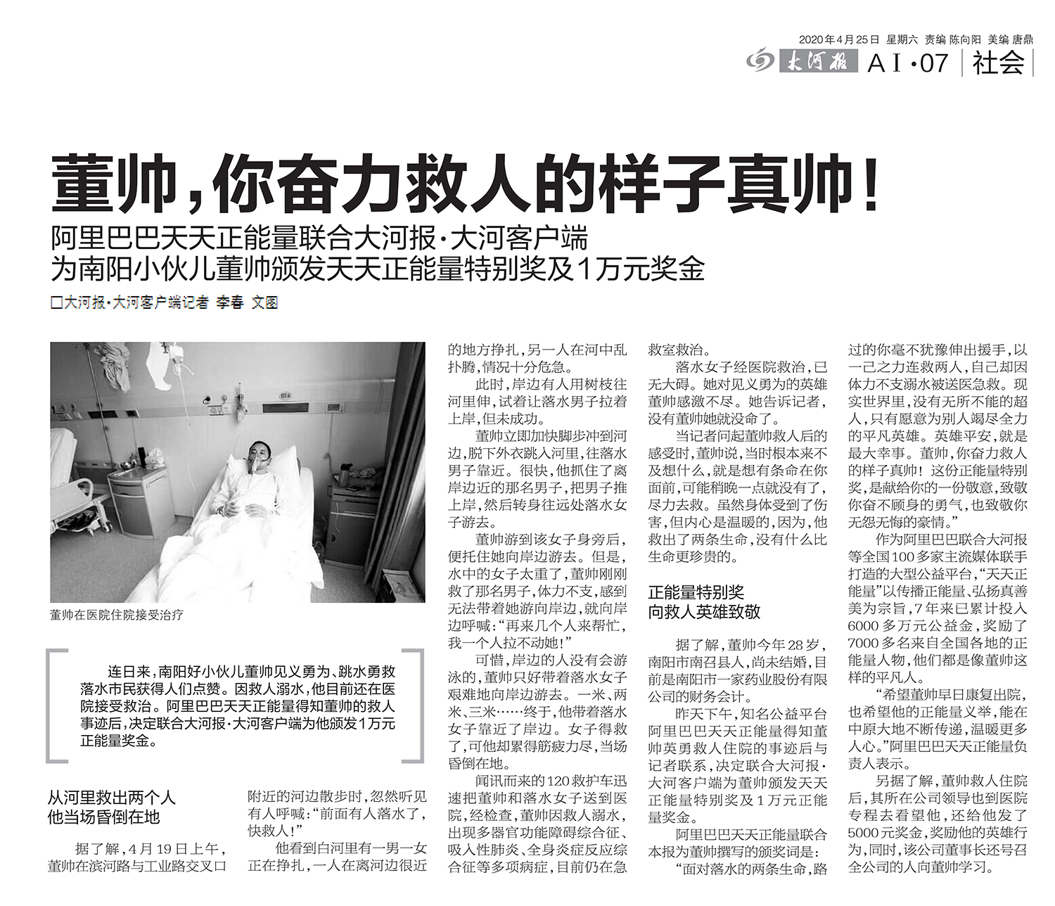 2020年4月19日,濱河路與工業(yè)路交叉口附近的河邊一男一女落水,散步路過的董帥不顧個人安危,挺身而出,以一己之力連救兩人,自己卻因體力不支溺水被送醫(yī)急救,因多器官功能障礙綜合征、吸入性肺炎、全身炎癥反應(yīng)綜合征等多項病癥在醫(yī)院治療十余日。2021年12月,董帥被臥龍區(qū)授予“見義勇為”榮譽稱號。